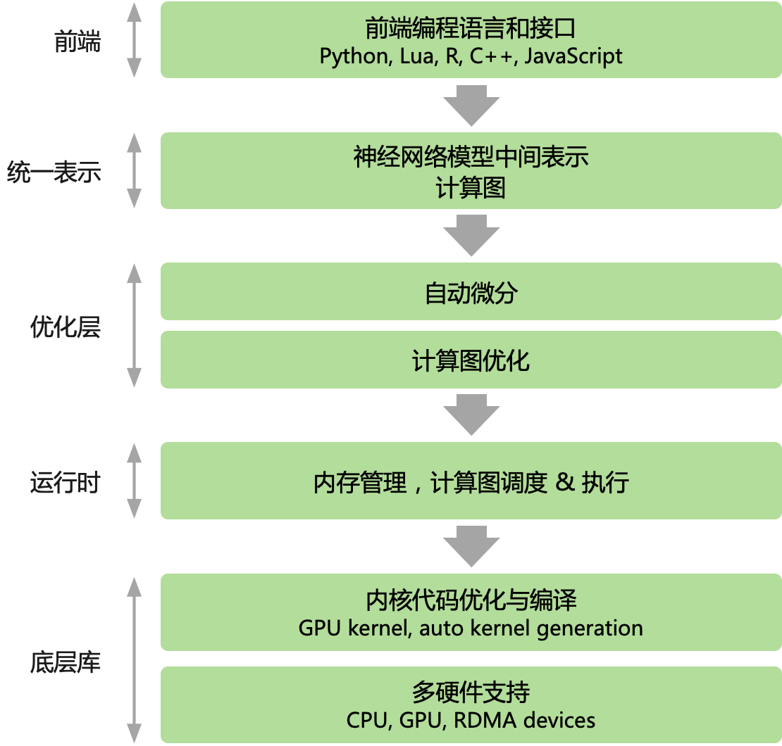 通过静态的计算图提出,可以为 AI 框架切分出三个解耦的优化层,分别对应图中的不同颜色:1)计算图优化;2)运行时调度优化;3)算子/内核执行优化。